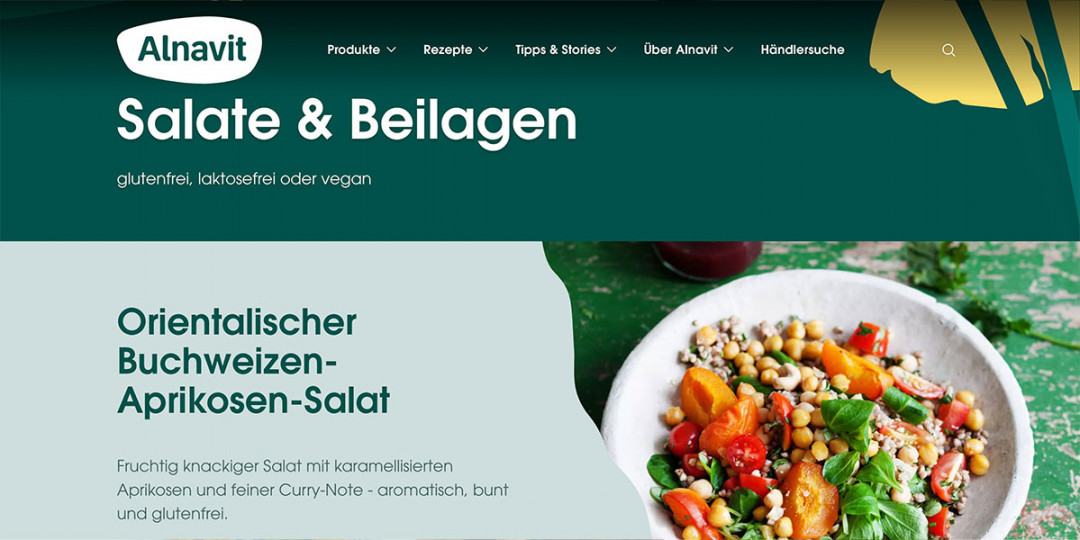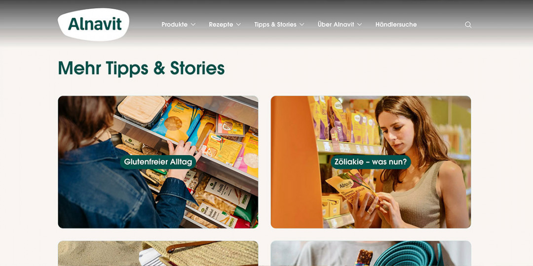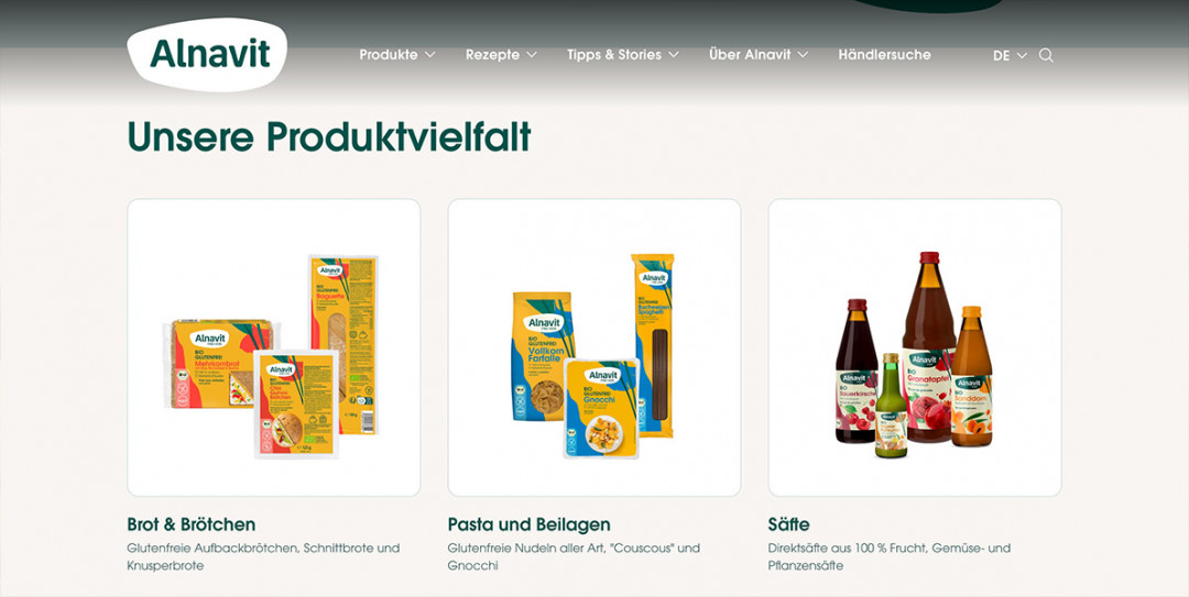 Alnavit ist Teil der Alnatura Markenfamilie und steht für glutenfreie, laktosefreie und vegane Bio-Produkte. Mit dem Relaunch der Corporate Website wurde die zentrale digitale Anlaufstelle für die wachstumsorientierte Marke neu gedacht. Ziel war es, die Markenbindung zu stärken, das emotionale Produkterlebnis zu intensivieren und den Weg zu Produkten und Händler:innen so einfach wie möglich zu machen.