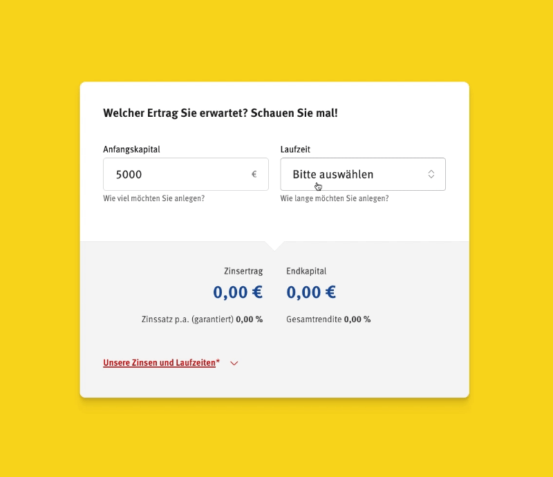 Ein besonderes Feature der Seite ist der dynamische Zinsrechner. Der sieht nicht nur schick aus, sondern ist auch praktisch. Interessent:innen können damit in Echtzeit berechnen, welchen Ertrag sie erwarten können. Einfach Anfangskapital eingeben, Laufzeit auswählen und fertig. Klar, einfach und schnell.